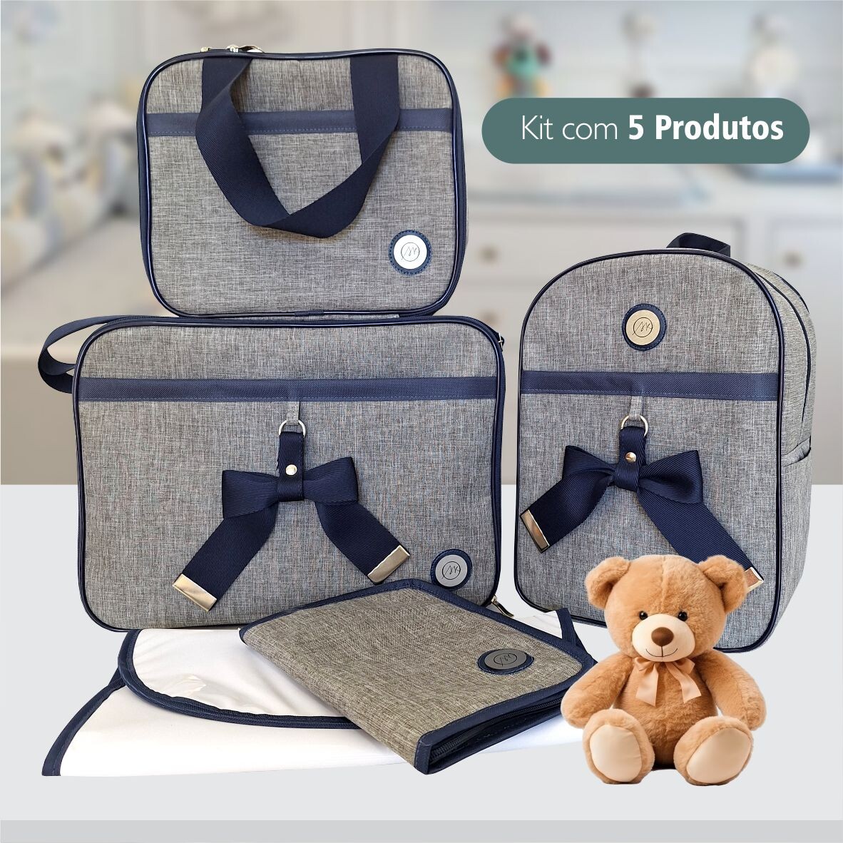 R$189,70O preço original era: R$189,70.R$94,85O preço atual é: R$94,85.Bolsa Kit Maternidade 5 Peças Para Menino Azul Marinho